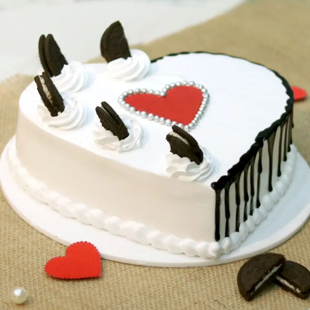 It is a heart shape black forest cake covered with white cream. It is decorated with chocolate layer, white cream flowers, oreo biscuits and red flavored heart shaped chocolate