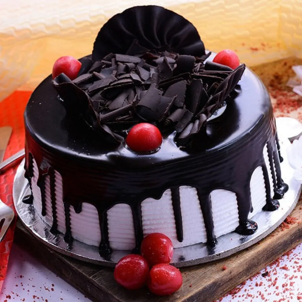 It is an attractive round shape black forest cake covered with white cream and its top is decorated with a thick layer of chocolate and icing and cherries.