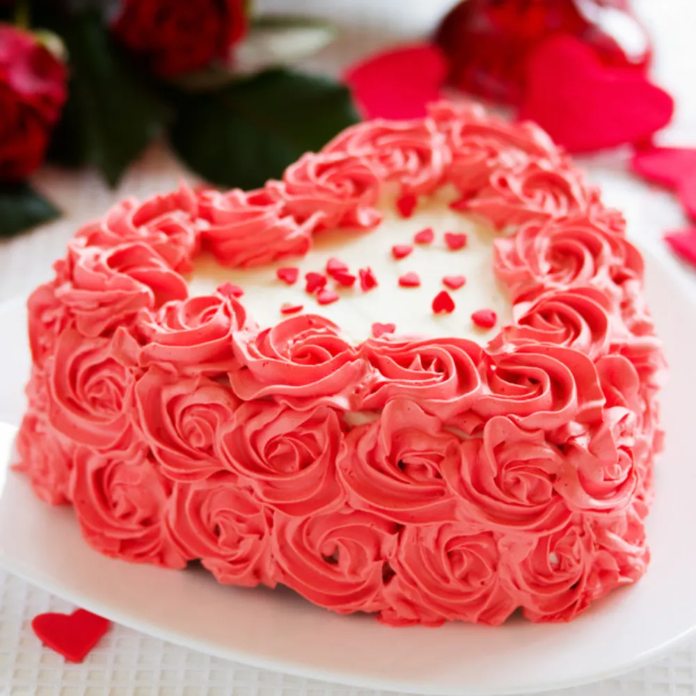 It is a heart shaped strawberry flavored cake covered with white cream and again decorated with red cream flowers.