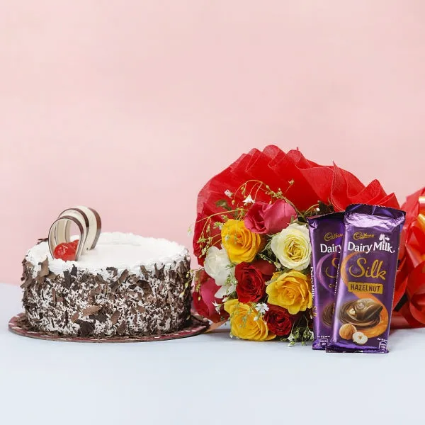 A lovely combo that will not just express but spell your love. This lovely combo of Roses beautifully wrapped and tied wit a ribbon, and one delicious cake with chocolates will be a perfect pick for occasions such as Date Night, Birthday, Valentine's, Anniversaries, Mother's Day and more such occasions when you wish to make the loved one feel delighted.