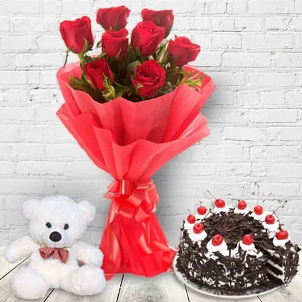 This charming combo includes a stunning bouquet of red roses with lush green fillers, a rich and indulgent Black Forest cake, and a soft, cuddly small teddy bear. The roses are elegantly arranged and wrapped with a ribbon, the cake is adorned with decadent chocolate ganache, and the teddy bear adds a warm, affectionate touch. Together, these items create a delightful and romantic gift set perfect for any special occasion.