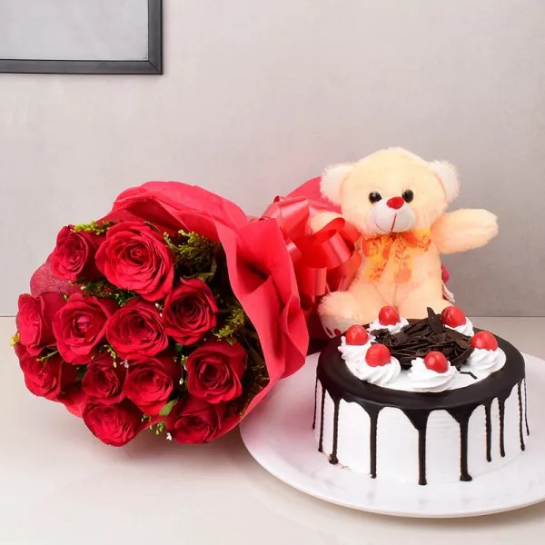 A lovely combo that will not just express but spell your love. This lovely combo of Roses beautifully wrapped and tied wit a ribbon, and one delicious cake with Teddy will be a perfect pick for occasions such as Date Night, Birthday, Valentine's, Anniversaries, Mother's Day and more such occasions when you wish to make the loved one feel delighted.