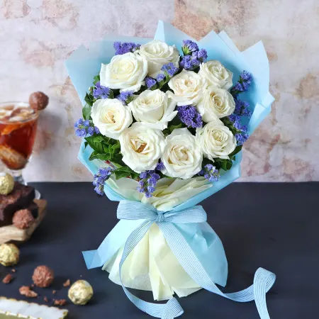 The combo of a chocolate cake and a white roses bouquet is a classic and elegant gift for any occasion. The chocolate cake is a delicious and indulgent treat, with its rich, velvety chocolate flavor that is sure to please. The smooth and creamy texture, along with the chocolate shavings and ganache, will leave a lasting impression. The white roses bouquet is a symbol of purity, innocence, and grace, and is a timeless gift that never goes out of style. The bouquet is made up of freshly picked white roses, arranged in a delicate and graceful manner and wrapped in paper for preservation. This combo is sure to make the recipient feel special and loved.