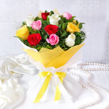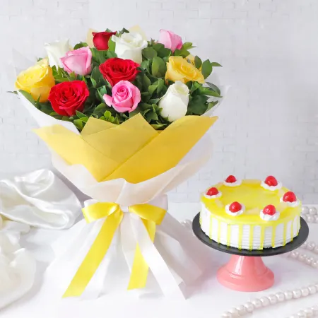 The combo of pineapple cake and mixed roses bouquet would be a delightful surprise for any special occasion. The cake, made of juicy and sweet pineapple, would make for a perfect dessert. The mixed roses bouquet, consisting of various colors, would add an element of beauty and elegance to the overall combo. The bouquet could include a mix of red, yellow, pink, and white roses, all arranged together to create a visually stunning display. The bouquet would be wrapped in colorful paper and ribbon, completing the look of this delightful combo.