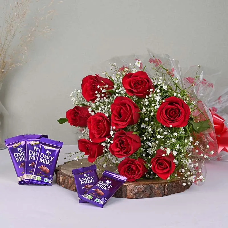 A combo of red roses bouquet and dairy milk would make a perfect gift for someone special. The bouquet of red roses is a classic symbol of love and passion and will be sure to brighten up the recipient's day. The bouquet features vibrant red roses arranged in a beautiful bouquet that is accented with green leaves and stems. The bouquet is wrapped in cellophane paper with a bow made of red ribbon, giving it a touch of sophistication. Along with the bouquet, a bar of Dairy Milk chocolate is included, adding a sweet touch to the gift. The chocolate bar is creamy and delicious, and the perfect way to show someone how much you care. This combo would be a great gift for Valentine's Day, an anniversary, or simply to let someone know that you're thinking of them.
