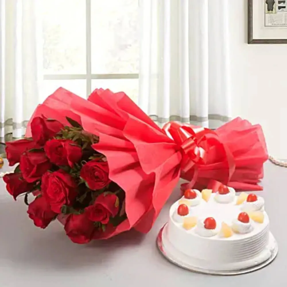 The combo of pineapple cake and red roses bouquet is a thoughtful and sweet gift for a special occasion. The pineapple cake is a moist and delicious treat, with a tropical flavor that is sure to please. The cake is covered with a creamy, fluffy frosting and has a beautiful golden color. On top of the cake, there are juicy pineapple pieces, adding to its flavor and visual appeal. The red roses bouquet is a symbol of love and passion. The bouquet consists of freshly cut, long-stemmed red roses that are arranged in a neat and elegant manner. The vibrant red petals of the roses contrast beautifully with the green leaves, making the bouquet a stunning sight. The bouquet is tied together with a red ribbon, adding a touch of sophistication to the overall look.