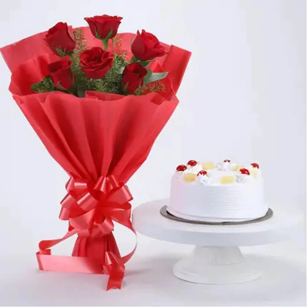 The combo consists of a rich and juicy pineapple cake paired with a stunning bouquet of deep red roses. The pineapple cake features a light and fluffy sponge with sweet, tropical flavor, which is topped with a generous amount of creamy frosting. The bouquet of red roses adds a romantic touch to the combo, with their bright and bold color symbolizing love and passion. The bouquet is tied together with a ribbon, which adds a touch of elegance to the presentation. Together, this combo makes the perfect gift for a loved one on a special occasion, or simply to show appreciation and love.