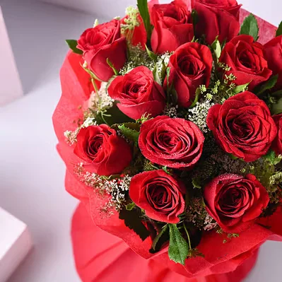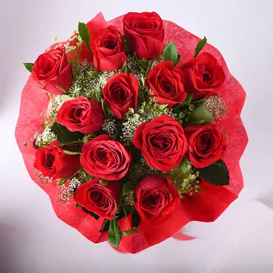 A bouquet of red roses is a classic and timeless gift that symbolizes love and passion. It typically consists of several long-stemmed red roses, each with delicate petals and lush green foliage. The roses are arranged in a circular shape and tied together at the stems with a ribbon or twine, creating a bouquet that is both elegant and romantic.