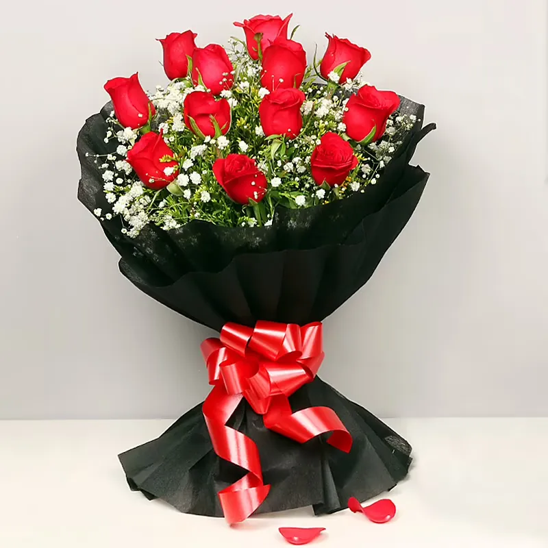 A bouquet of red roses is a classic and timeless gift that symbolizes love and passion. It typically consists of several long-stemmed red roses, each with delicate petals and lush green foliage. The roses are arranged in a circular shape and tied together at the stems with a ribbon or twine, creating a bouquet that is both elegant and romantic. The deep red color of the roses is said to represent love and desire, making them a popular choice for special occasions like anniversaries, Valentine's Day, or to express heartfelt emotions. The roses are typically fragrant, adding to their beauty and charm. The bouquet could be accompanied by a thoughtful note or card to convey your sentiments.