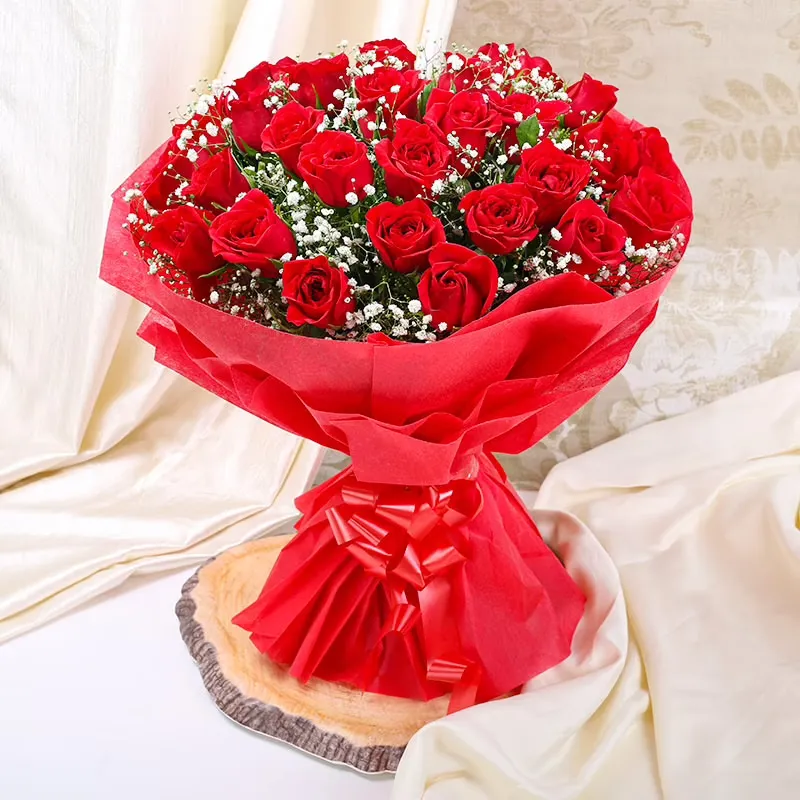 A bouquet of red roses is a classic and timeless gift that symbolizes love and passion. It typically consists of several long-stemmed red roses, each with delicate petals and lush green foliage. The roses are arranged in a circular shape and tied together at the stems with a ribbon or twine, creating a bouquet that is both elegant and romantic. The deep red color of the roses is said to represent love and desire, making them a popular choice for special occasions like anniversaries, Valentine's Day, or to express heartfelt emotions. The roses are typically fragrant, adding to their beauty and charm. The bouquet could be accompanied by a thoughtful note or card to convey your sentiments.